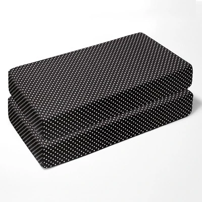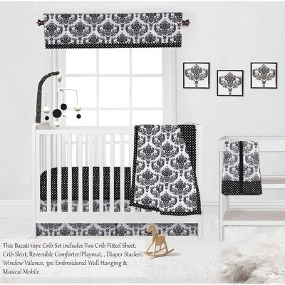 - This Bacati 10-piece Crib Set Includes Reversible Comforter/Playmat (33 x 43 inches), Two Crib fitted sheets (52 x 28 x 6 inches), Crib Skirt/Dust ruffle (13 inch drop) Diaper Stacker (holds more than 30 newborn diapers), Window Valance (15 h x 56 w inches with 1.75 inch Rod Pocket), 3 pc Wall Hangings Set and Musical Mobile in fun, colorful and signature prints in 100 percent cotton 200 Thread Count percale fabrics. Designed in United States by Experienced Designers. Many coordinating items available to purchase separately in this Bacati Classic Damask Black/Grey/White Bedding Collection.