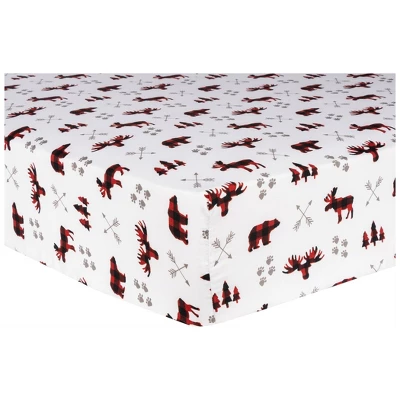 - Fitted crib sheet fits standard crib mattress 28 in x 52 in with 8-inch-deep pockets and is fully elasticized for a secure fit. Crib sheet features a woodland moose and bear scatter print surrounded by arrows and paw prints in paloma gray, warm red and black on a white background.