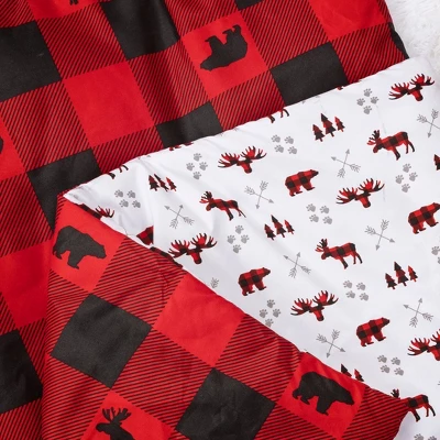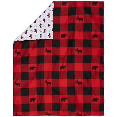 - Nursery quilt measuring 35 in x 45 in and features a moose and bear buffalo check print in black and warm red on one side and a moose and bear scatter print surrounded by arrows and paw prints in paloma gray, warm red and black on a white background on the other.
