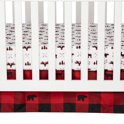 - Crib skirt fits standard crib mattress 28 in x 52 in with 14-inch drop and features a buffalo check print with a moose and bear in black and warm red.
