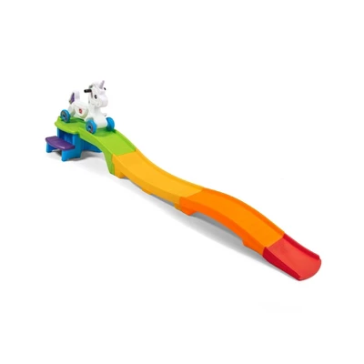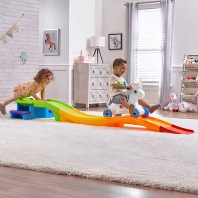 Coast into the magical world of unicorns on the Step2 Unicorn Up & Down Roller Coaster™! Full of fun and whimsy, this unicorn-themed coaster is ready for kids to ride into fantasy land aboard an adorable unicorn car. Lock the steps into the platform, where the unicorn awaits the journey through 9 feet of rainbow riding track. Two easy-grip handles, foot rests, and a high back ensure a secure ride on the unicorn car. A motion activated light and sounds add to the magic as little ones ride! Made in the USA of US and imported parts.